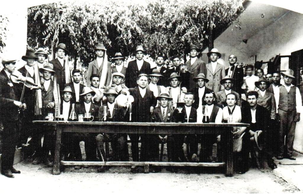 Október elsején mentek a legények Galántára sorozásra. A lányok felvirágozták a kocsikat. Ha bevált a legény, a lányok szalagot tűztek a kalapja mellé. Minél híresebb volt a legény, annál több szalagot kapott. Így földíszítve, csoportosan nótázva megkerülték a falut, tudtára adva a világnak rátermettségüket a katonaéletre. Majd a kocsmában mulattak a többiekkel. Az udvaron a hosszú asztal mellett ülnek a vendégek, jobb oldalon a kocsmárosné, Török Ilona, mellette a kocsmáros, Dobosy Sándor. A bor mellé cigányzene is dukált. A hátsó sorban a regrúták, kiknek kalapja mellett lógnak a színes szalagok, a nagy nap emlékére. Noha ezen a felvételen csak kilencen ülnek, az énekkar fél évszázaddal később is szívesen énekelte a következő dalt: Hosszú asztal mellett tizenketten ülnek, Hej, mind a tizenketten rólam beszélgetnek. Rólam beszélgetnek, katonának visznek, Letöltöm a nyolc évemet, haza is eresztnek.