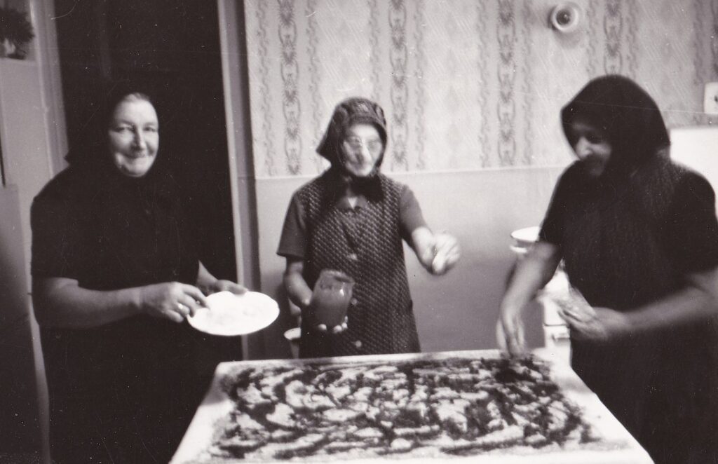 Csintalanné Czunyi Margit a szomszédasszonyokkal rétes süt a lakodalomra.
