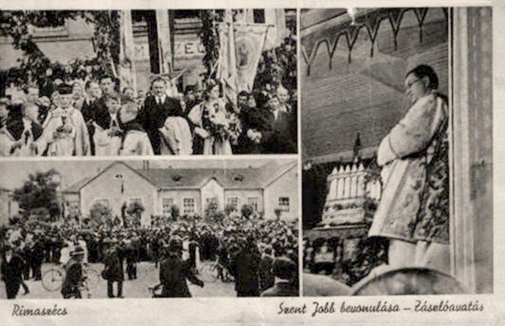 A képen a Szent Jobb bevonulása a rimaszécsi állomásra és az község főterén lévő Országzászló avatása látható.