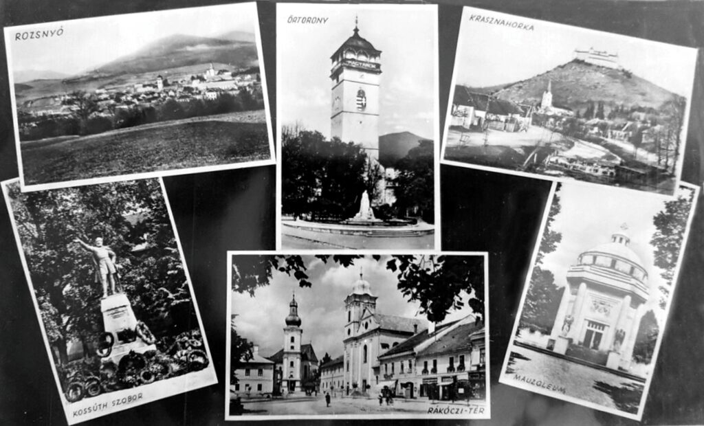 A képeslapon a rozsnyói táj és egyébb műemlék is látható, mint a Kossuth szobor vagy a Rákóczi-tér és az őrtorony.