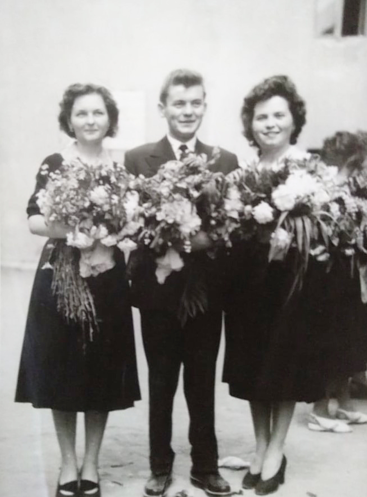 Rozsnyó 1959, Pedagógiai Iskola. Három ballagó diák: Molnár Aranka, Pál Dénes Nagybalogról, Géczi Éva.