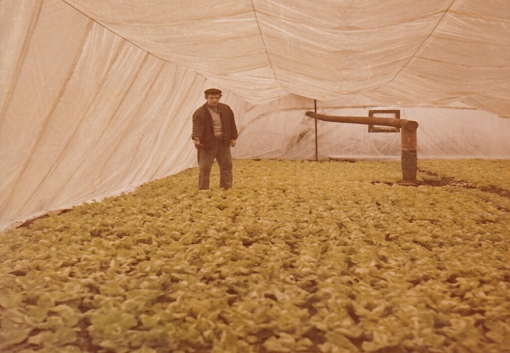 A fóliasátor alatt Bödők Dénes (szül: 1944). Több mint 2000 fej salátát ültetett tavasszal. A fűtés fa- illetve házilag készített vegyes tüzelésű kazánnal történt.