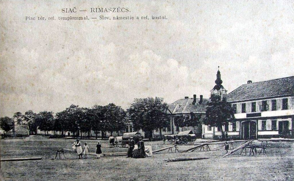 A képen a főutca közepén elterülő piactér látható. Háttérben a református templom, jobboldalt a Kolozsi-féle kúria épülete látható.