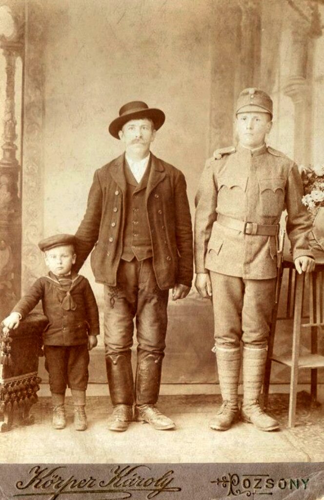 Balról jobbra: ifj. Szabó Ferenc, Szabó Ferenc, Szabó István. A katona az első világháborúban hősi halált halt. Nevét márványba vésték a vágai Hősök szobrán. Az első világháborúban 77 vágai lakos vesztette életét a magyar hazáért.