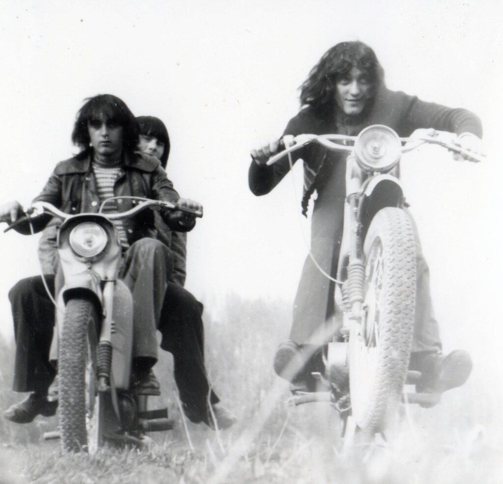 Motorosok a Vág partján. Balról jobbra: Jawa Pionier 21-esen Krizsan Árpád (vágai neve: Öcse), hátul Bakó László (vágai neve: Hosszú). A sárga Mustangon Jalsovszky József (vágai neve: Jodi).