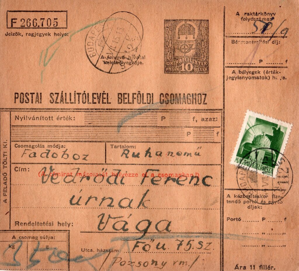 Budapesten, az akkori fővárosban feladott csomag postai szállítólevele.