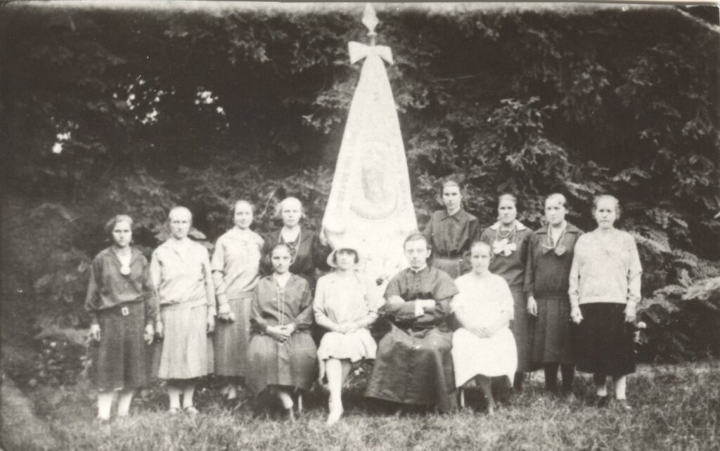 A felvételen Szikora Jenő plébános látható kongregációs (?) lányokkal (templomdíszítők), ifjúsági zászlóval (kb. 1928-30-ban).