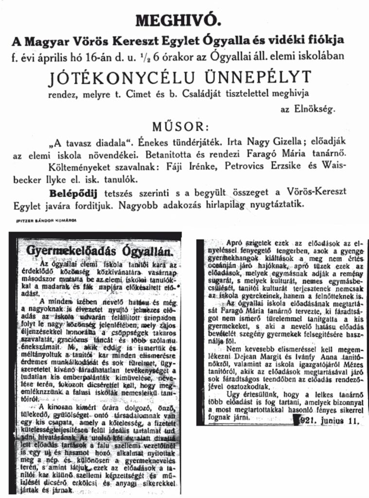 Előadás a Vöröskereszt javára (a meghívó évszám nélküli). Az előadás címe: A tavasz diadala, betanította Faragó Mária.