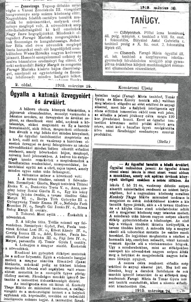 Színjátszás 1915 márciusában Ógyallán. A tavasz tündére és A kályha titka c. előadás Konkoly-Thege Miklós részvétele mellett. Faragó Mária, Timár Gyula és Mézes Károly mint felkészítő pedagógusok.
