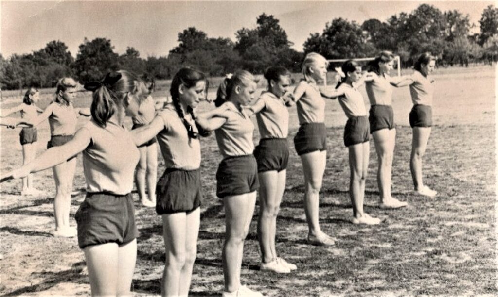 A Vág partján levő focipályán, a Szpartakiád gyakorlása közben.