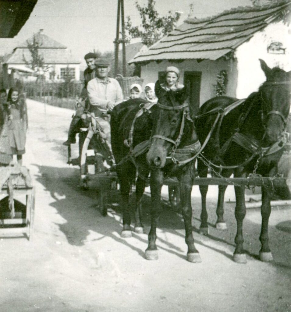 A fénykép a Kosdi ház udvarában készült 1965-ben. A lovaskocsin „öreg” Etus néni és (Rancsóné) Nagy Erzsébet.