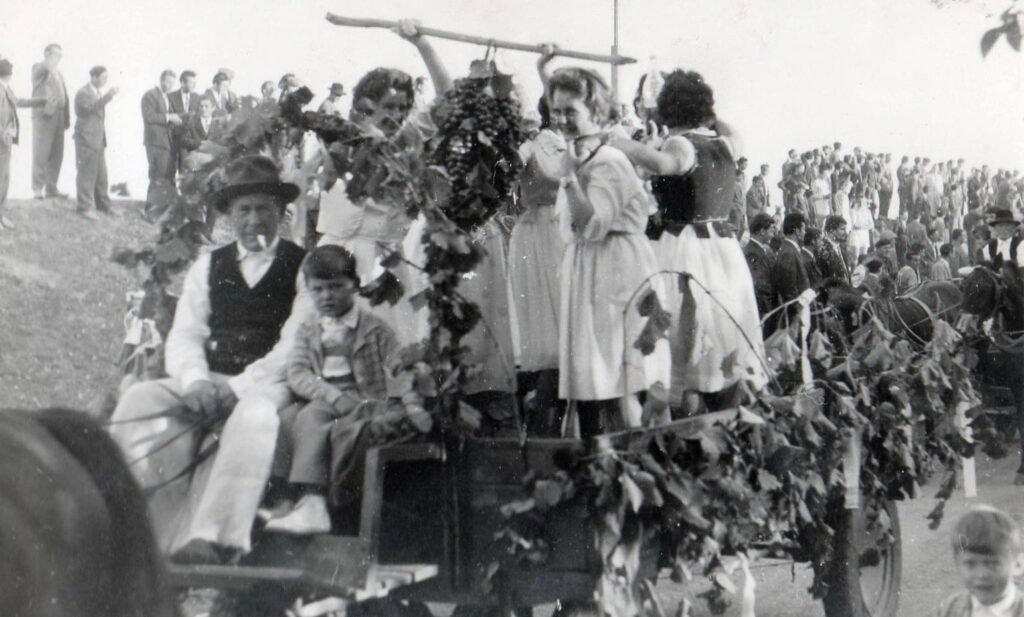 Régen szüreti ünnepség is volt a községünkben. Ilyenkor szüreti lovaskocsis menet vonult végig a vágai utcákon. A fotón látható, hogy éppen a régi töltésnél tartanak egy kis bemutatót…