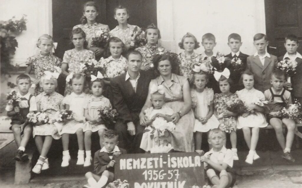 A rakottyási nemzeti iskola tanulói és tanárai az 1956/57-es tanévben. A községben napjainkban már nincs oktatási-nevelési intézmény.