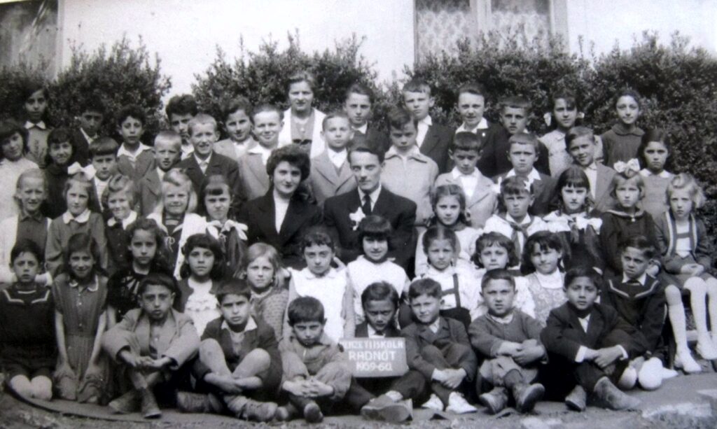 A nemesradnóti alapiskola diákjai és tanárai az iskola előtt az 1959/60-as tanévben. Ferencz Katalin több mint 30 évet dolgozott itt.