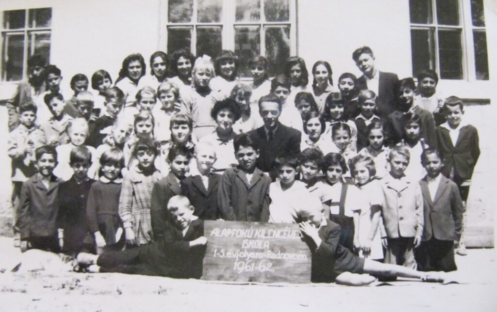 A nemesradnóti alapiskola diákjai és tanárai az iskola előtt az 1960/61-es tanévben. Ferencz Katalin több mint 30 évet dolgozott itt.