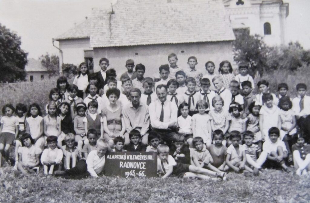 A nemesradnóti alapiskola diákjai és tanárai az iskola előtt. Ferencz Katalin több mint 30 évet dolgozott itt.