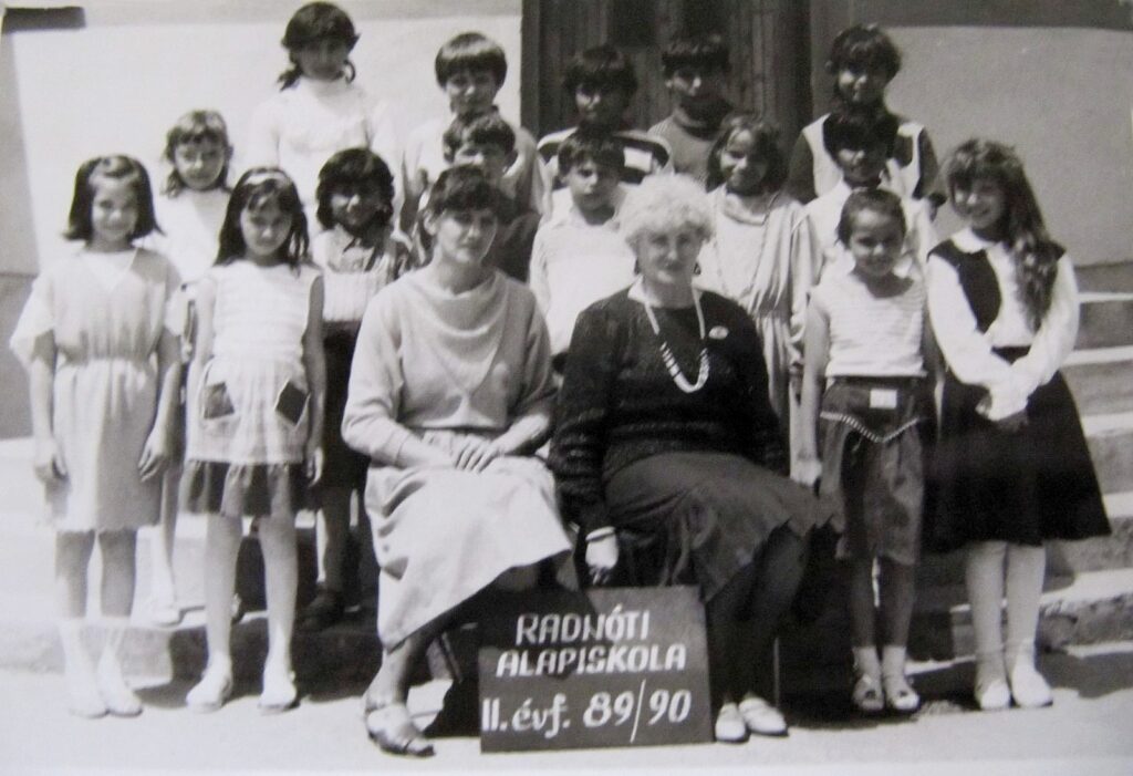 A nemesradnóti alapiskola II. évfolyamos diákjai és tanárai az iskola előtt az 1989/90-es tanévben. Ferencz Katalin több mint 30 évet dolgozott itt.
