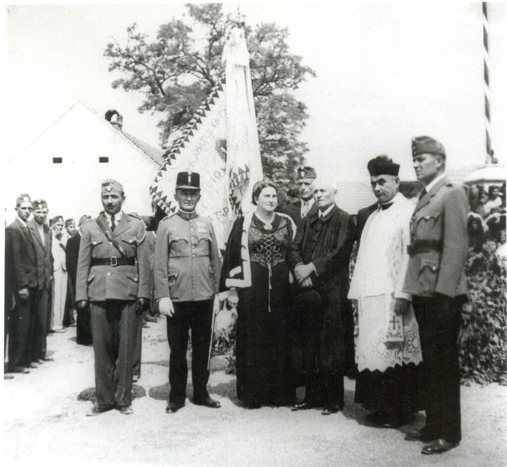 A nagymegyeri országzászlóavatás története szorosan kapcsolódik Nagymegyer és Tápiógyörgye baráti kapcsolatainak kialakulásához. Tápiógyörgyén az elöljáróság már 1938. december 2-án foglalkozott az országzászló ajándékozásával, amit Nagymegyernek szántak. Ez végül nem valósult meg, mert az 1938/39-es év fordulóján a Kelenvölgyi Kaszinó testülete megkereste a nagymegyerieket felajánlásával, akik ezt elfogadták. Az országzászló ünnepélyes felavatására 1939. június 4-én került sor Nagymegyeren. Két nappal az Országzászló felhúzása után, 1939. június 6-án, a nagymegyeriek személyesen üdvözölhették a tápiógyörgyei leventék küldöttségét, akik a Nagymegyeri Levente Szervezetnek elhozták az általuk készített levente zászlót. A képen a nagymegyeri vendéglátokat látjuk a levente zászló átadásakor. Köztük Marczy József római katolikus plébános, Németh Géza községi bíró és felesége, aki egyúttal a zászlóanya szerepét is vállalta.