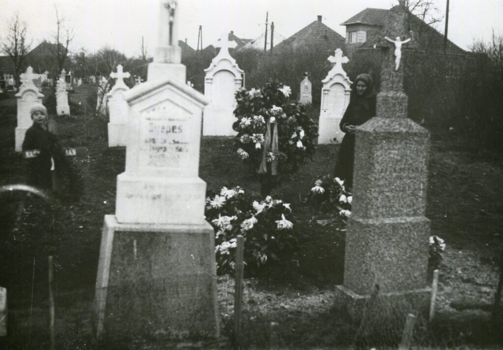 Temetői kép idősebb asszonnyal és gyermekkel egy friss sírnál.