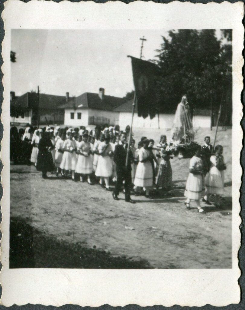 A templomi körmenetek a községben gyakoriak voltak (húsvét, búzaszentelés, keresztjáró napok, úrnap, búcsú, menet a pogrányi Jézus Szive búcsúba stb.). A képen nem állapítható meg az ünnepnap. A háttérben a főutcát látjuk.