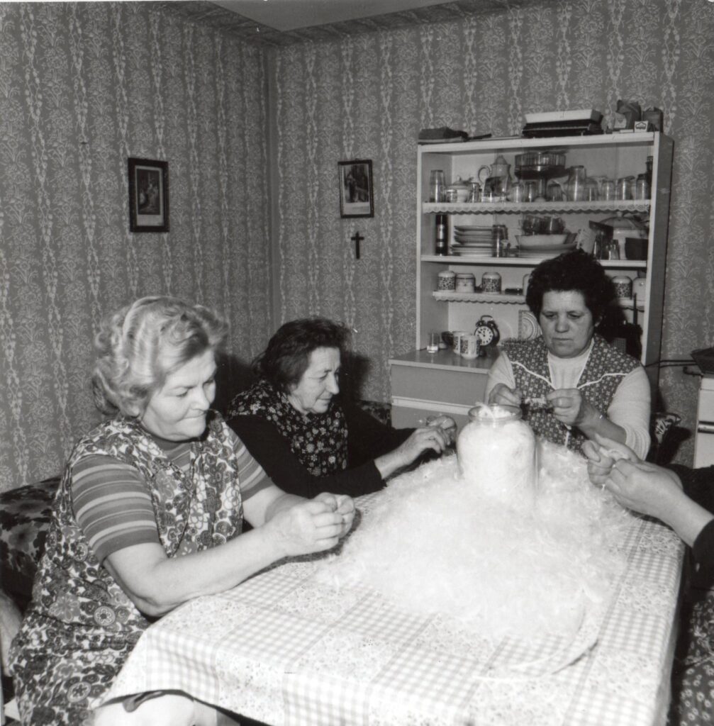 Az adventi időszak munkája a közös tollfosztás. Ilyenkor egy-egy háznál 20-25-en is összejöttek. Főként asszonyok, lányok. Az esténként végzett munka után pattogatott kukoricával, főtt lóbabbal, csípkával (aszalt alma), cukorrépából és céklából cukros-ecetes-köménymagos vízzel készült kompóttal, kávéval vagy teával kínálták a tollfosztókat. Az áldomásra görhönyt (kalácsféleség) készítettek. A fotón: Hornák Irma (született Forró), Szabó Júlia (született Szabó) és Forró Júlia (született Kubica).
