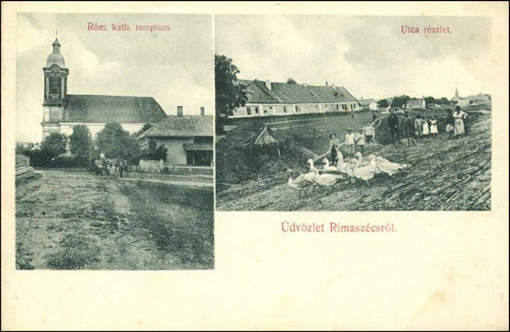 Egyike az első Rimaszécset ábrázoló képeslapnak. Az első kép a katolikus templomot ábrázolja a Szeles utca felől, és a második kép a Kissori utca-részt ábrázolja a volt várárok felől.