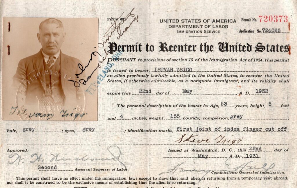 Zsigó István újrabelépési engedélye az Amerikai Egyesült Államokba (USA).