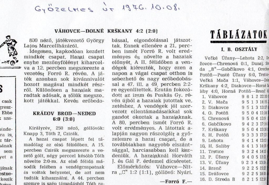 Forró Ferenc vágai tudósító írása a meccsről, mikor Forró Róbert (Roba) három gólt rúgott, egyet meg Puskás György (Bitang), s ahol 800 néző volt a hazai mérkőzésen.