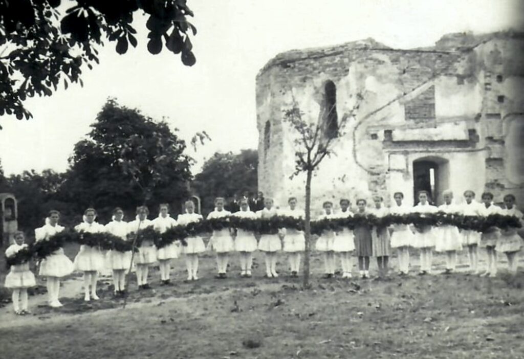 Tisztlányok az úrnapi színeket készítik. A kép a II. világháború utáni években készült. Háttérben jól látható a felrobbantott templom.