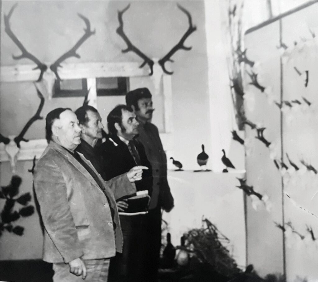 Csenkei vadászkiállítás, 1987 vagy 1988. Balról az első Mikoczi József, ?, Fellinger Lajos, Szikela László.