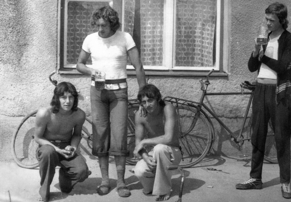 A kocsma előtt, balról jobbra: Bugyi Péter, Jalsovszky József, Krizsan Árpád, Molnár József.