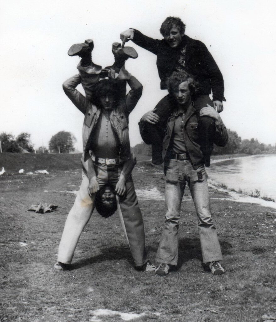 A Vág folyó jobb partján, balról jobbra: Jalsovszky József és Brestovsky Miklós (fejjel lefelé), Práger Vilmos és Cakó Tibor (felül).