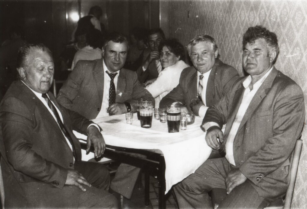 Az asztalnál ülnek, balról jobbra: Adamkó Vladimír, Hulák Ernő, Lukács József, Forró Ernő.