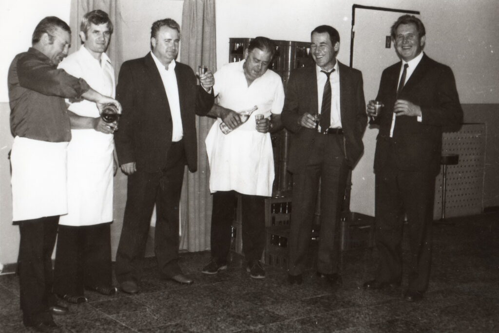Lakodalomban a kultúrház előcsarnokában, balról jobbra: Hanusz Ferenc, Mészáros Jenő, Karácsony István, Jakubecz Árpád, Czakó Ince, Hlavaty Oszkár.