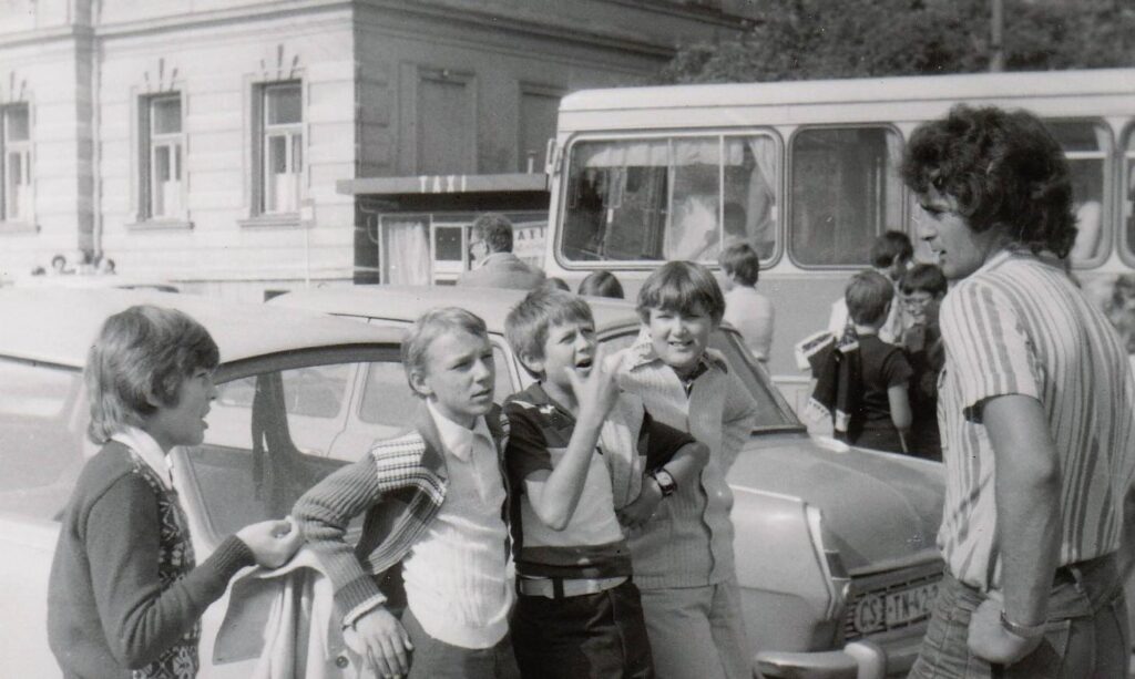 Iskolai kiránduláson, balról jobbra: Kubica Róbert, Lulovics Miroslav, Éliás Zoltán, Takács Lubomír, Juhász Aladár (osztályfőnök).