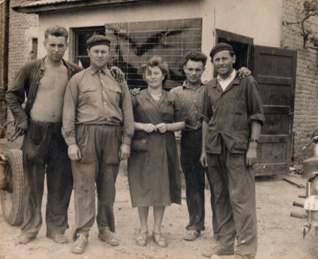 Az Egységes Földműves Szövetkezet dolgozói: Jalsovszky Róbert (balról), Jalsovszky János, Bakó Anna (született: Józsa), Hulák Jenő, Silný Michal.