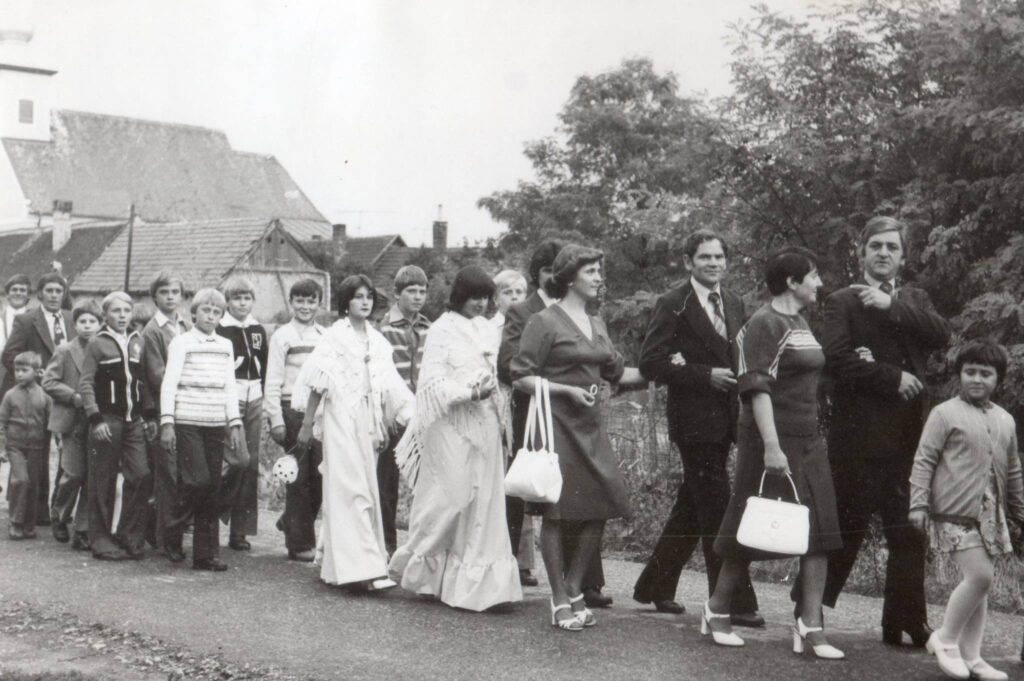 Horváth Jenő és Hrabovský Jana lagziján, kultúrházba menet. Háttérben még a régi iskola egyik épülete, s az iskolakert is látható.