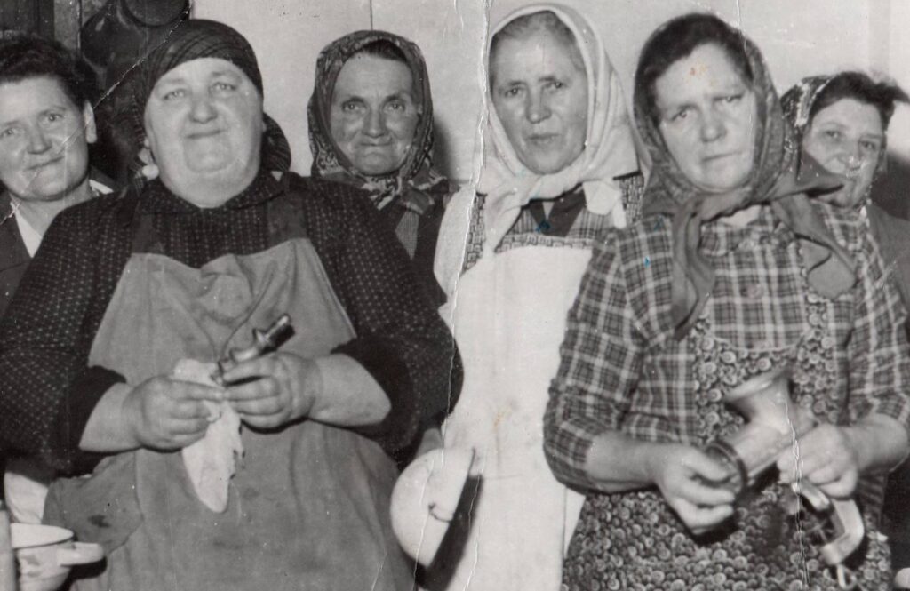 A régi lakodalmak még a családi házaknál voltak megtartva, ahol a fotón látható asszonyok főztek és sütöttek finom falatokat a meghívottaknak.