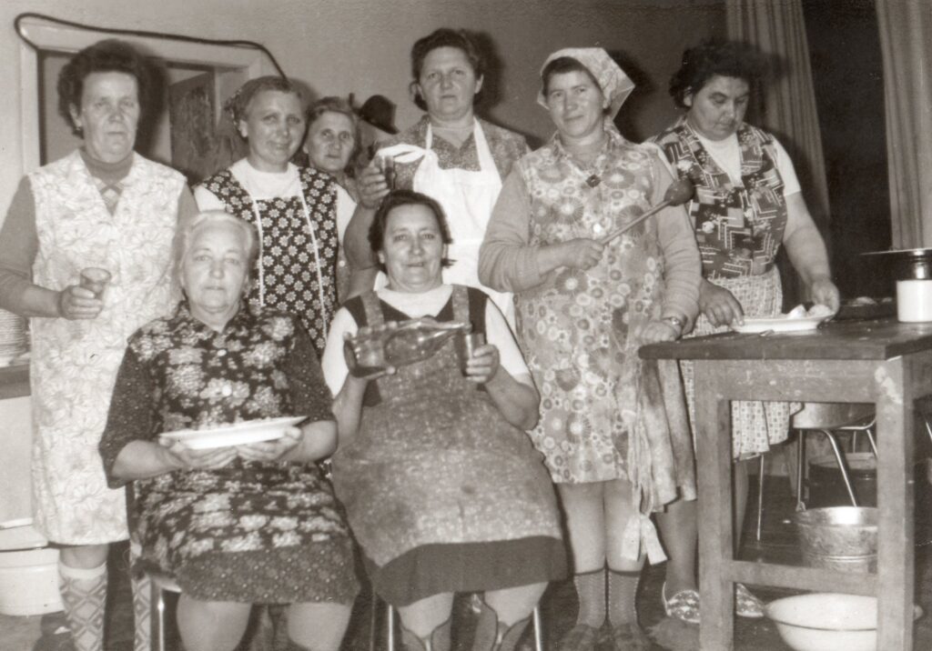 Szakácsnők csoportja a kultúrház színpadán, valamelyik menyegzőn.