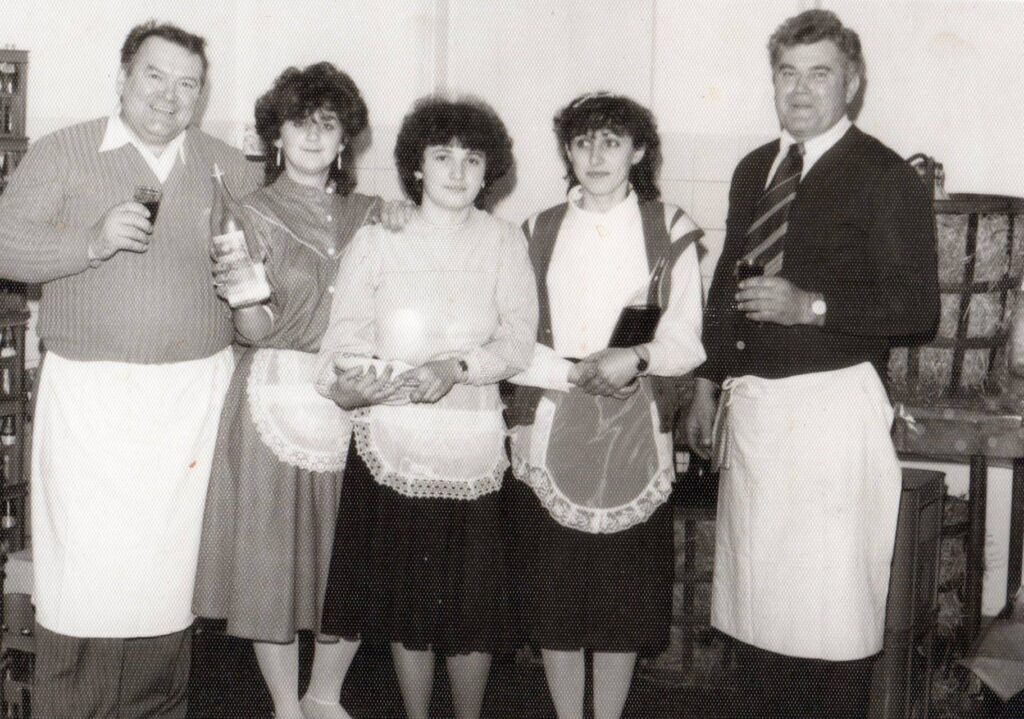 Kultúrházban tartott, valamelyik lakodalomban a felszolgálónők és a két csapos: id. Bakó Ernő (balról), Károly Judit (Kozmérné), Takács Margit (Slaninkané), Zsigó Rozália (Józsáné), Forró Ernő.
