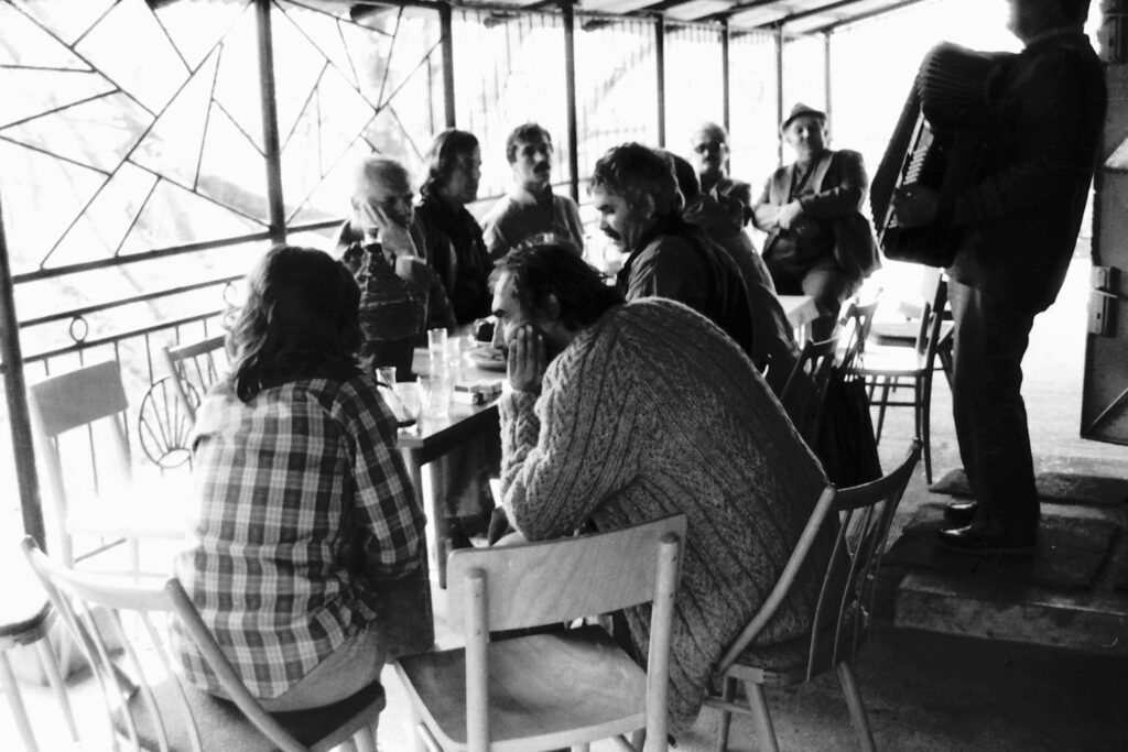 Gyökeres György fotográfus, Tisza Nagy Menyhért festő, Bodnár Gyula újságíró. Balról az asztal túloldalán ülő szemből, az első, a könyöklő, Dobos László, író, szerkesztő, műkritikus, politikus.