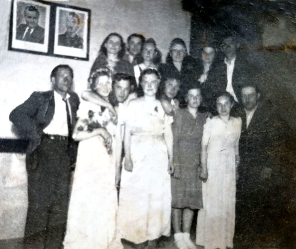 Egy akkori közösségi helyiségben, Klement Gottwald és Sztalin elvtársak képei előtt egy csapat …