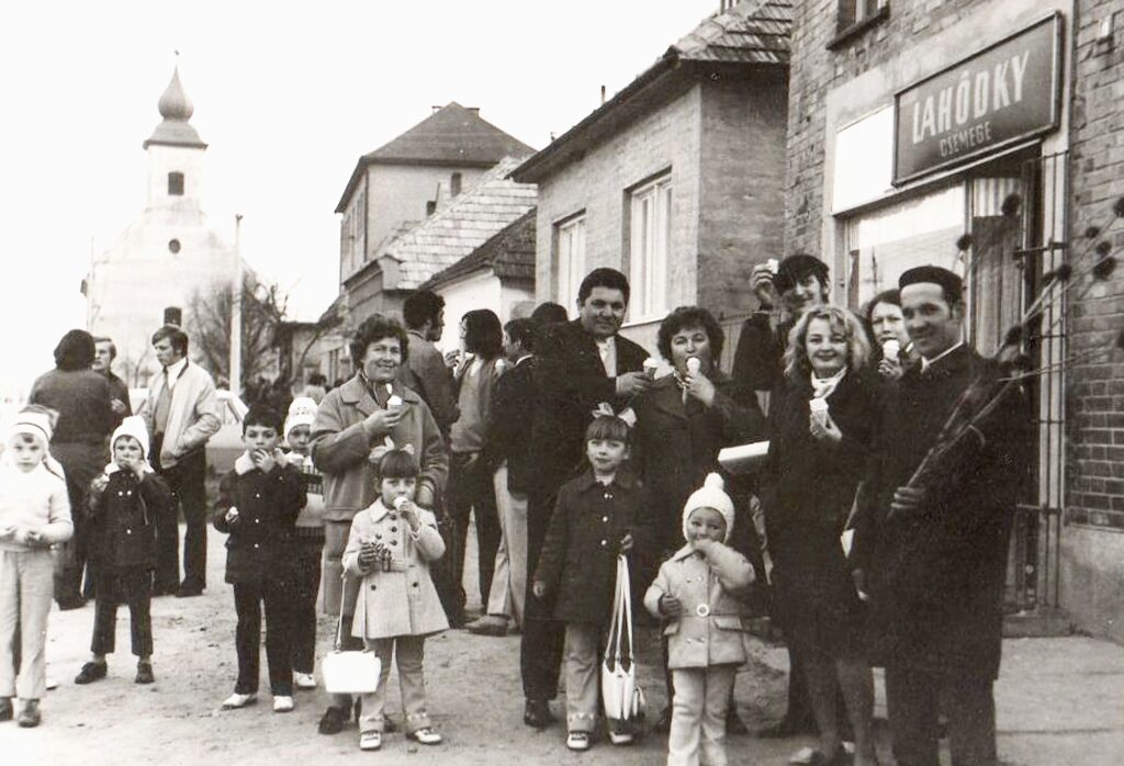 A cukrászda előtt: Sas Gyuszika, Sas Petike, Bakó Imike, Jalsovszky Enikő, Jalsovszky Ivi, Józsa Vilmos, Szabó Róbert, Kiácz Róbert, Adamkó Vilmos és a Jalsovszky család.