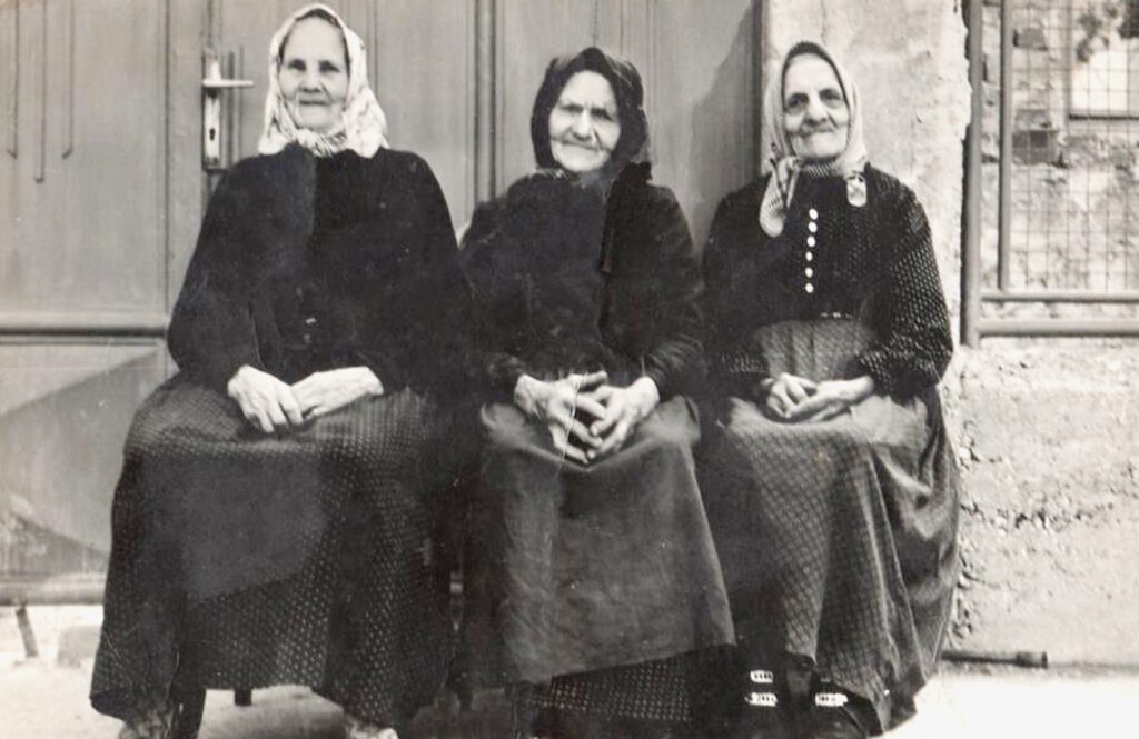 Alvégi nénik üldögélnek az utcán, balról jobbra: Szabó Gizella (született: Renács), Forró Borbála (született: Klaszta), Polakovics Borbála (született: Forró).