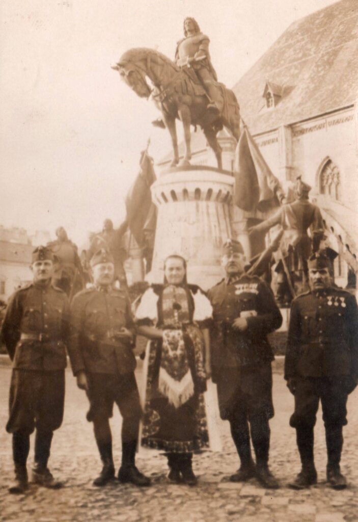 Vitéz Czakó Ferenc (jobbról a második) a harcostársaival és egy helybeli hölggyel, aki kalotaszegi népviseletben látható.