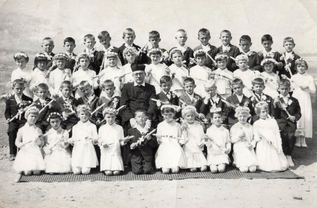 Fiúk ülnek, balról jobbra: Szuchopa János, Puskás György, Vedrődi Lajos, Kozmér Miroslav, Forró Gyula, Zsilinszky Kázmér (plébános), Kamenár Róbert, Bakó Tibor, Takács Ernő, Józsa István, Lukács Ernő, Szabó Imre.