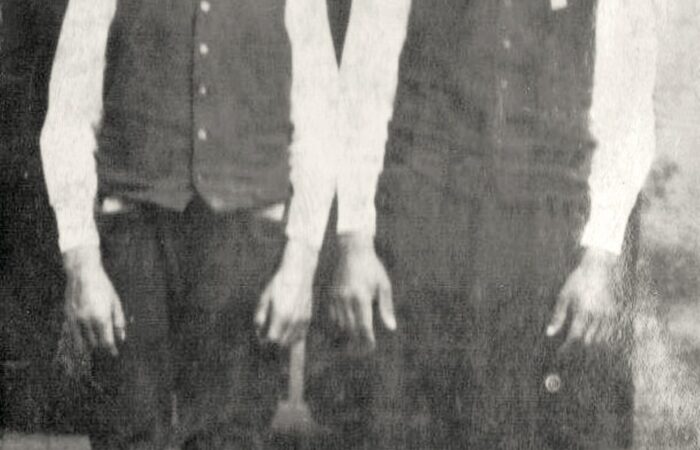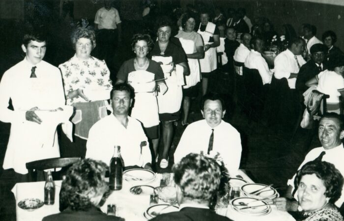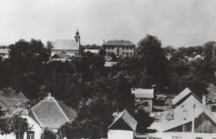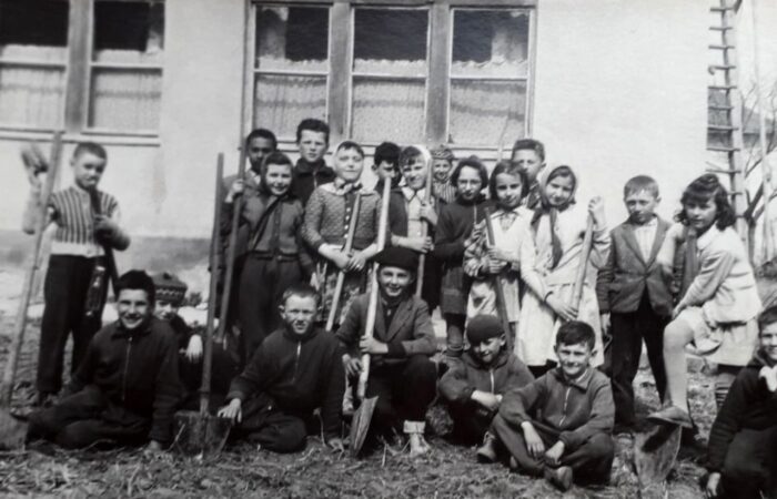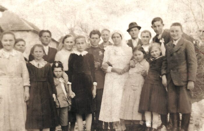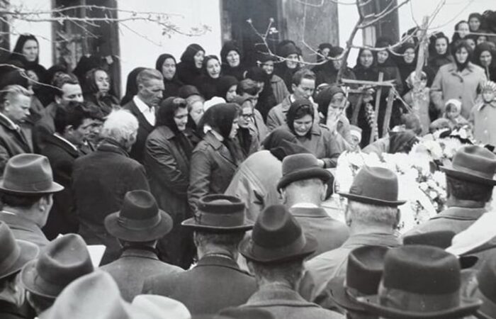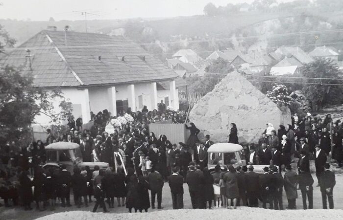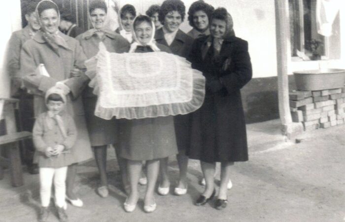 A babát tartja Kohút Magda, mellette balról Hirus Gizella, mögötte Szitás Rebeka, Papp Zsófia, jobbról Kovács Gizella, Sulák Julianna, Varga Gizella és a bábaasszony Szitás Aranka. A kicsi lány Kovács Erzsike. Keresztelő 1964-ből