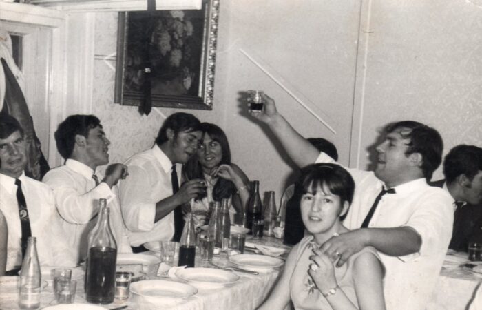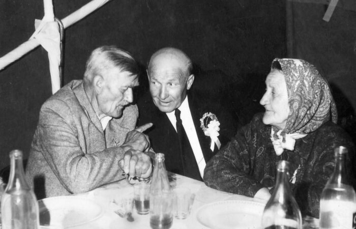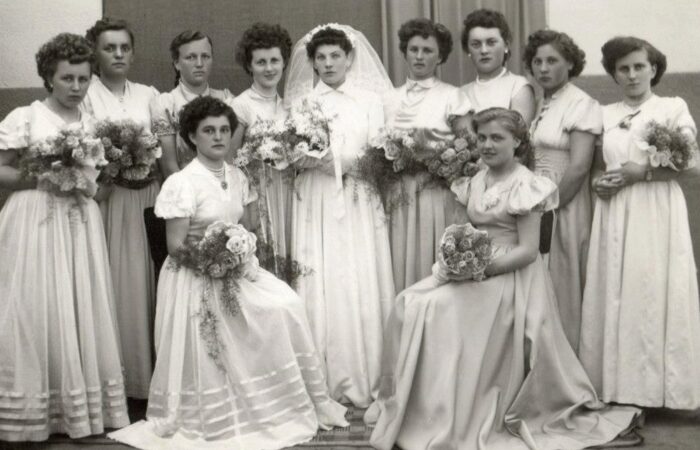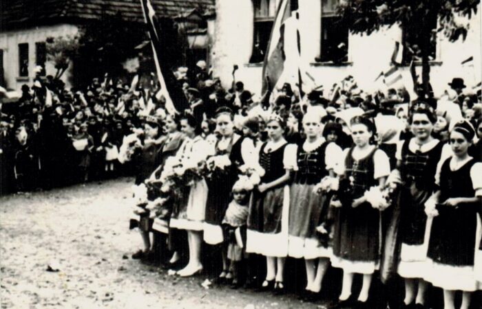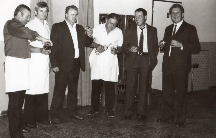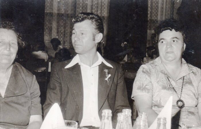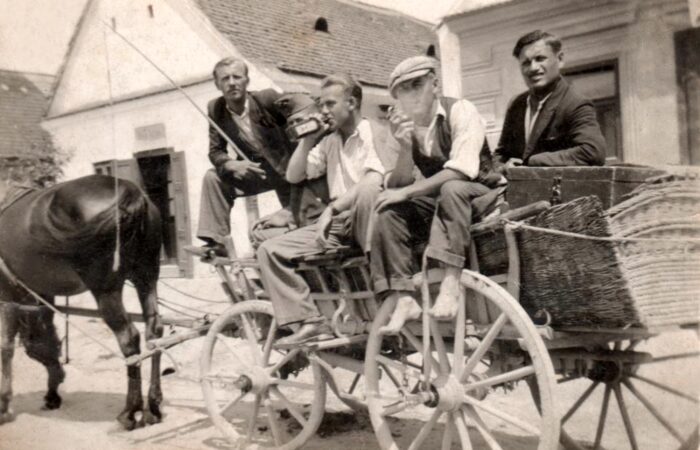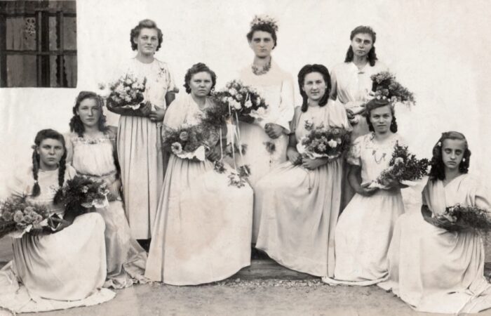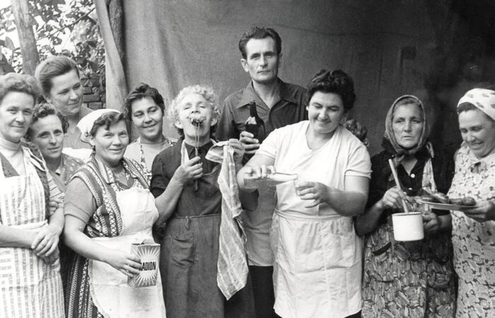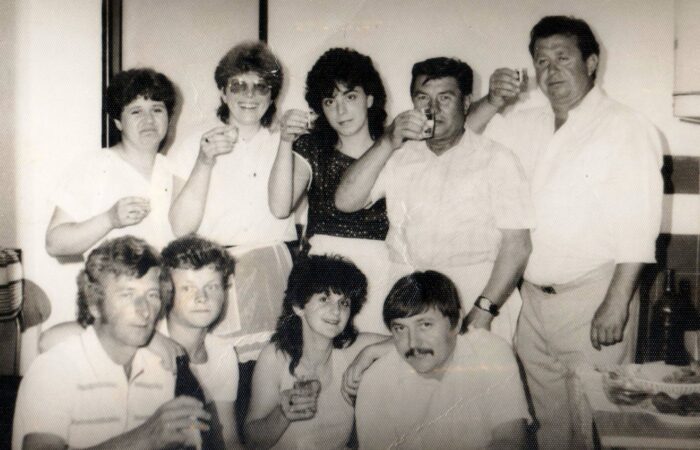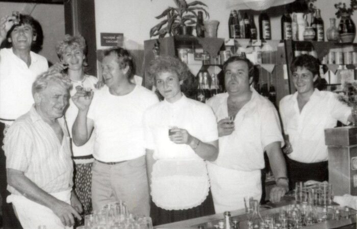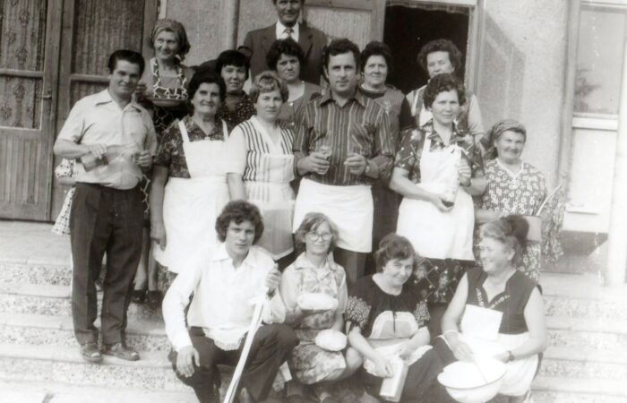 Vága, 1980-as években Kultúrház bejárata előtt a szakácsnők és a felszolgáló személyzet; valamelyik lakodalom kezdetén. Állnak balról jobbra: Hegyi Štefan, Józsa Jolán, Puskás Julianna, Fördős Margit, Józsa Irén, Forró Julianna, Zsigó Ferenc, Józsa János (boros gazda), Éliás Ilona, Hegyi Gizella, Gyevát Valéria, Puskás Mária. Guggolnak balról jobbra: Kamenár István (vőfély), Silný Ilona, Hulák Anna, Jakubec...