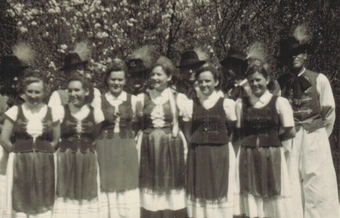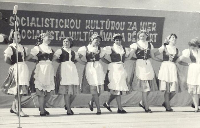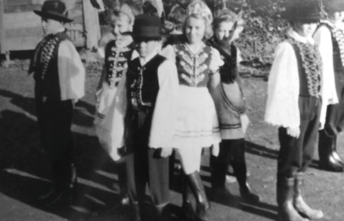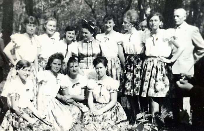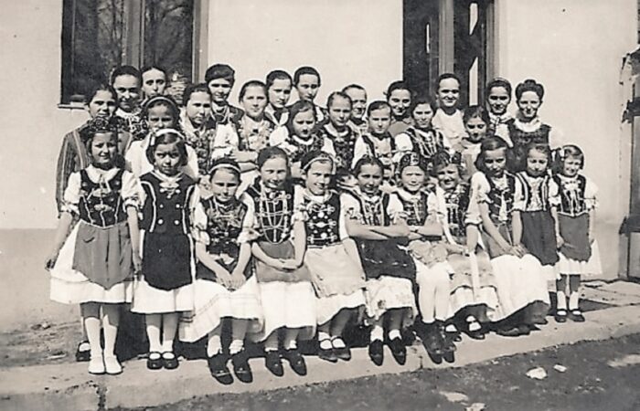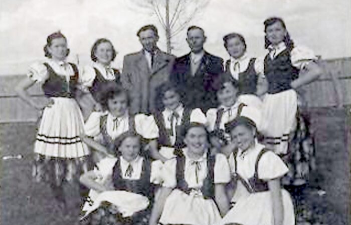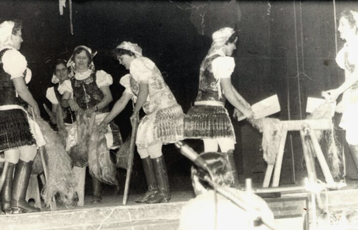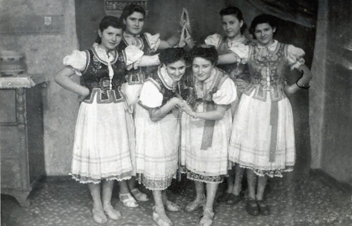 1952-ben készült kép a néptáncegyüttesről. A képen láthatók: Gallyas Katalin, Nagy Éva, Capics Júlia, Mikolay Teri, Pasztirák Erzsébet, Fehér Mária, Balogh Júlia, Köblös János, Király István, Mitro Gizella, Ocsenás Margit.