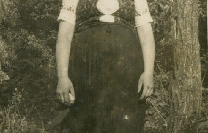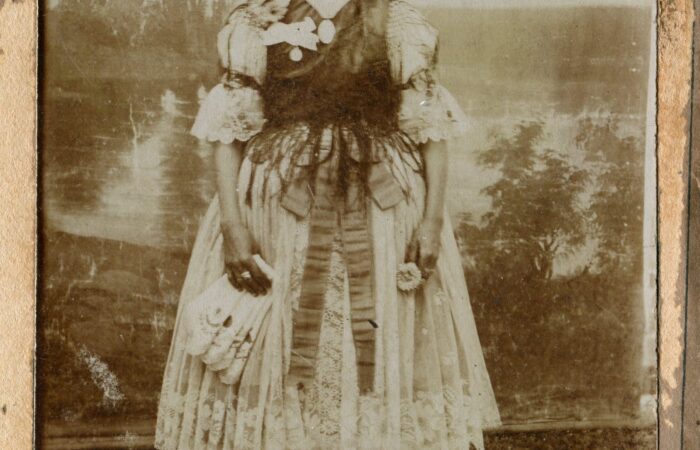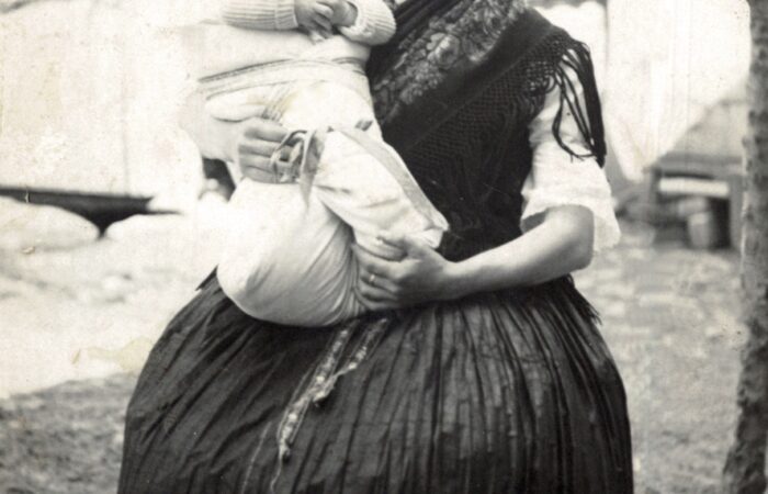 Jellegzetes, idegen elemektől szinte még mentes női vagy inkább lányviselet (ezt jelzi a fedetlen haj), hagyományos mellényben (ubbony), fodros ingben.